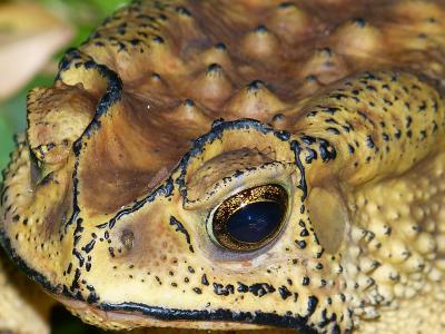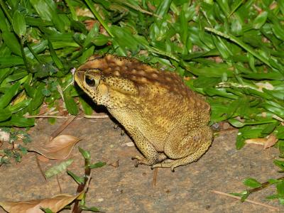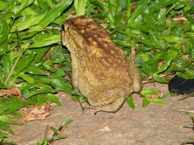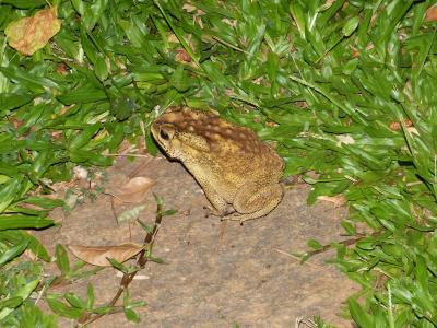 Letzte Woche hatten wir abends überraschenden Besuch im Garten. Ich schau ja immer wieder mal raus auf die Terrasse (allein schon wegen der Kobra im Garten vor einem Jahr) und sah im Dämmerlicht einen Kopf im Gras! Zuerst dachte ich: Eine Schlange! Ich schoss ins Esszimmer und holte die Kamera aus der Schublade! Draussen stellte sich heraus: Es war eine gigantische Kröte!