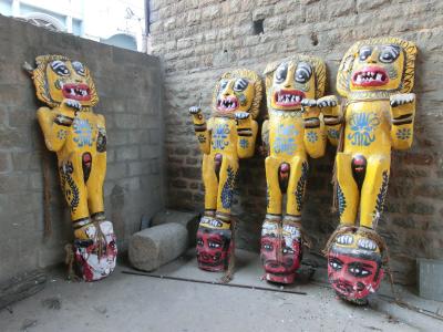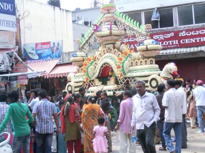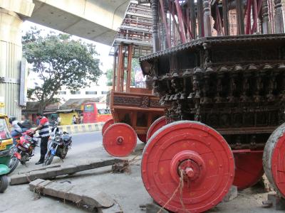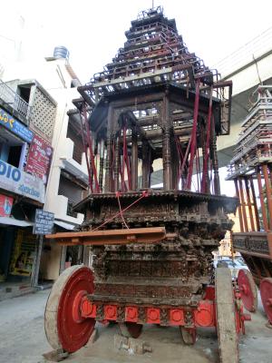 Für eine religiöse Prozession werden diese riesigen Wägen aus großen Verschlägen geholt und aufwändig geschmückt. Dann ziehen Männer des Dorfes oder des Stadtteils den Wagen durch die Straßen und es gibt ein (tagelanges) großes Fest.