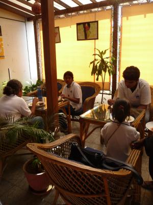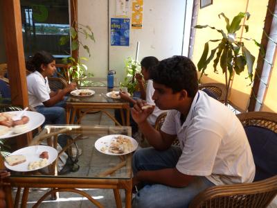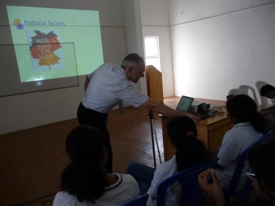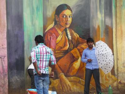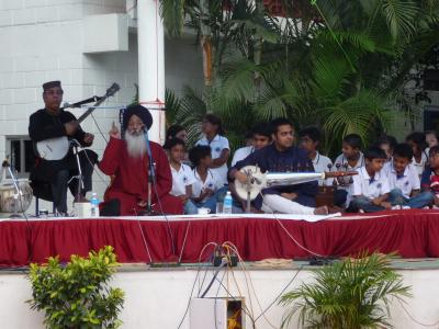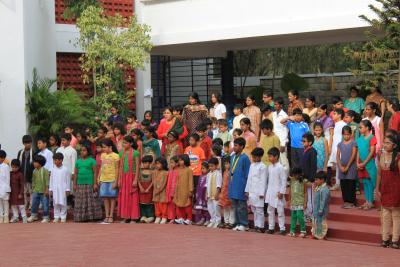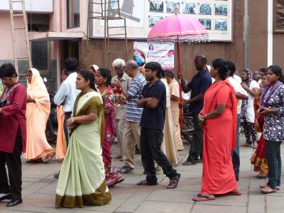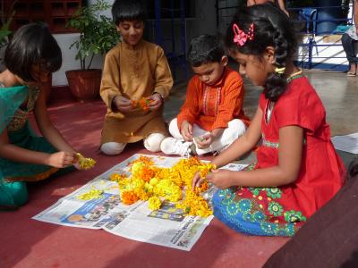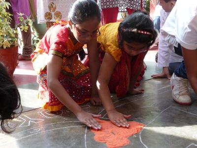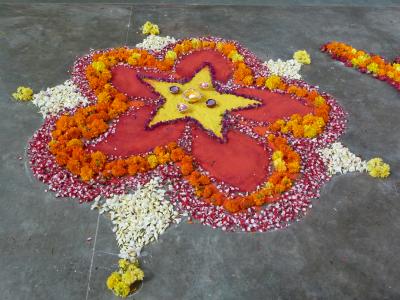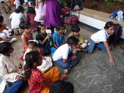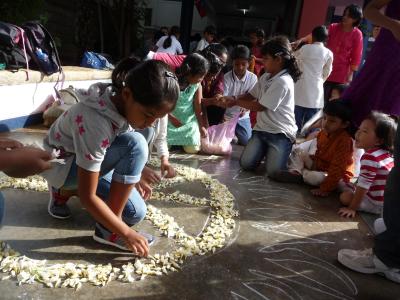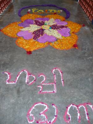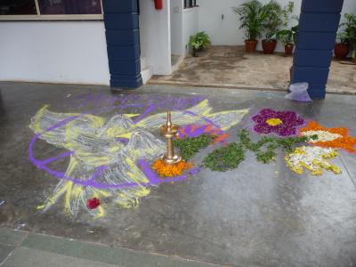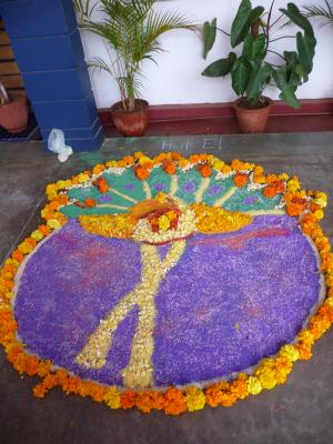 An meiner Schule wurden die Kinder deshalb in Gruppen aufgeteilt und alle halfen zusammen, um den König gebührend zu begrüßen: sie fertigten verschiedene Pookalam für ihn an:
